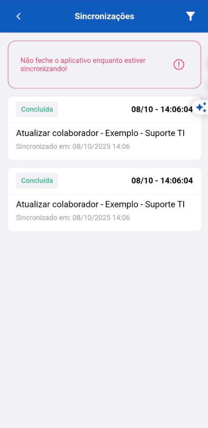 Enquanto não houver sinal de internet estável disponível para realizar as sincronizações, elas permanecerão como pendentes. Para sincronizar todas as atividades realizadas no app, é necessário que o sinal de internet seja estável.