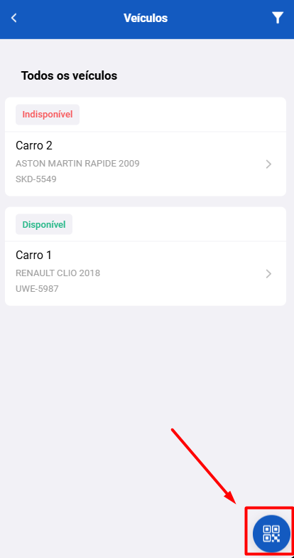 Passo 2: Agora, é possível ler o QR Code colado no veículo, clicando no botão QR Code indicado na imagem abaixo ou se preferir, selecionar o veículo na lista.
