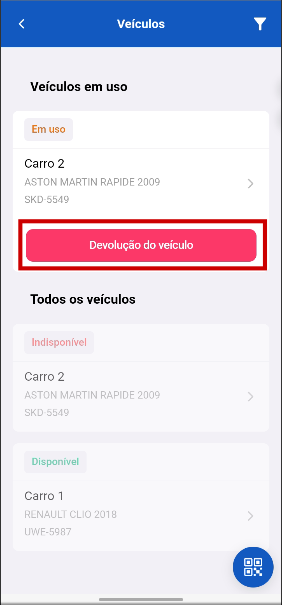 Passo 1: Após finalizar o uso do veículo, você pode devolvê-lo acessando Menu » Veículos e localizar o seu veículo em uso.