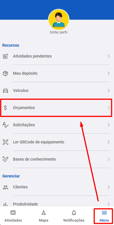 Passo 1: Primeiro, vamos acessar a tela de orçamentos. Para isso vá em Menu » Orçamentos