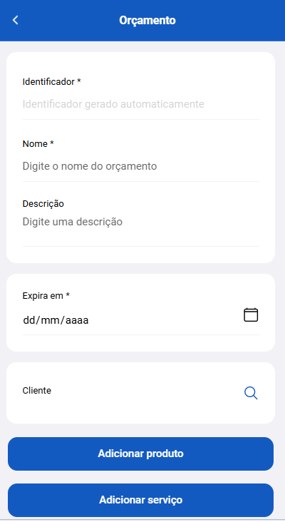 Passo 3: Preencha os campos com as informações do orçamento. Você também pode vincular produtos e serviços