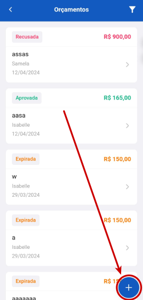 Passo 2: Para criar um novo orçamento basta clicar no ícone "+"