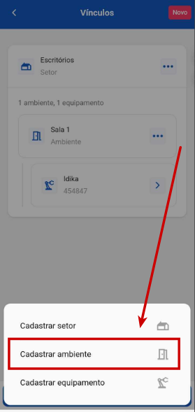 Passo 1: Ainda na tela de Vínculos, clique em "Cadastrar Novo" e selecione "Cadastrar ambiente"