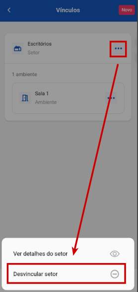 Caso necessário, você também pode desvincular o setor/ambiente. Basta clicar nos 3 pontinhos e selecionar "Desvincular setor"