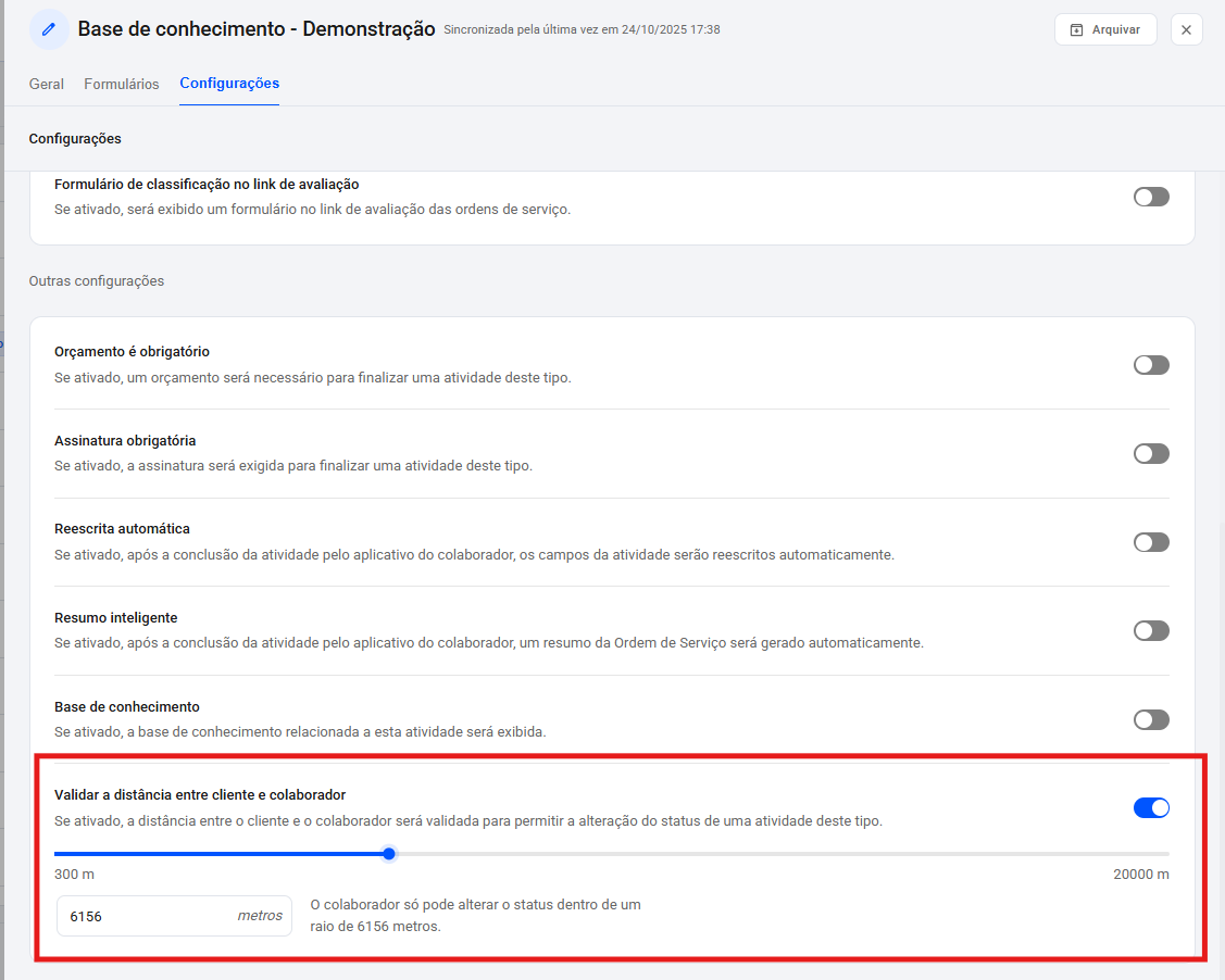 Também é necessário verificar se a validação de distância está habilitada. Essa é uma configuração ativada e ajustada pelo gestor, onde o colaborador poderá iniciar e finalizar a atividade somente dentro da distância determinada.
