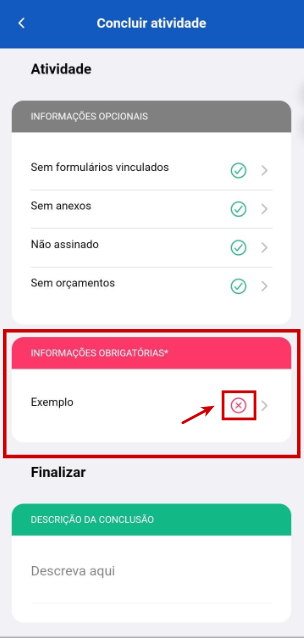 Caso apresente o "x" vermelho, significa que alguma informação obrigatória não foi preenchida. Nesse caso basta preencher, e já pode finalizar a atividade normalmente