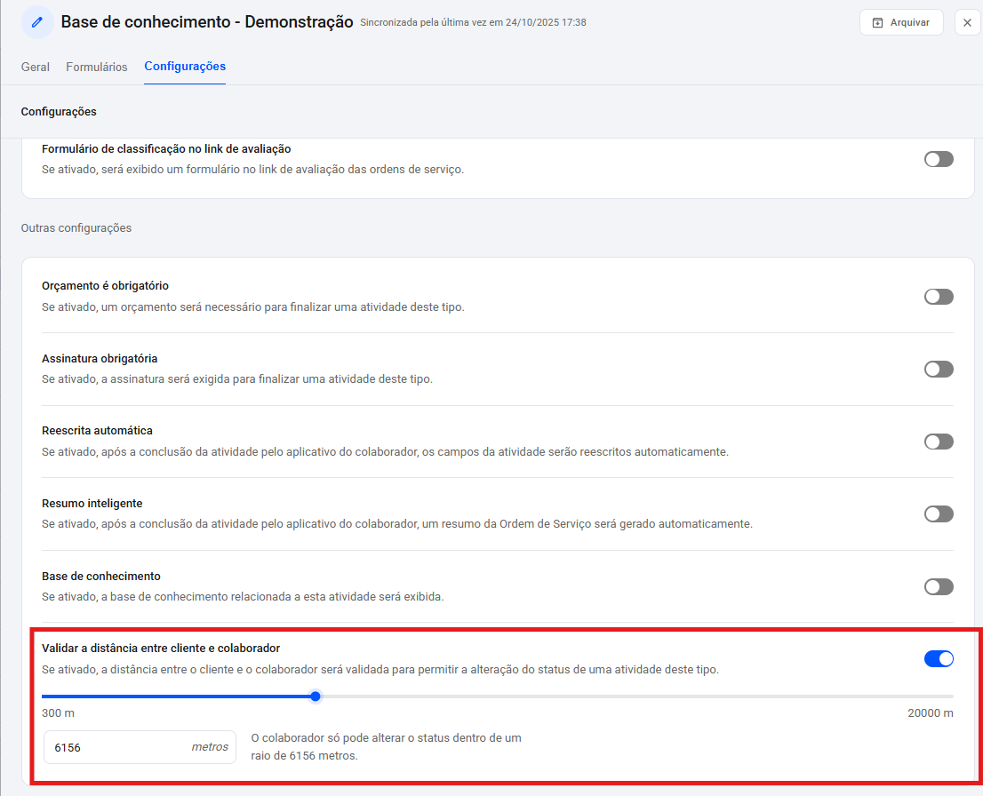 A primeira possibilidade é a validação de distância. Essa é uma configuração ativada e ajustada pelo gestor, onde o colaborador poderá iniciar a atividade somente dentro da distância determinada.