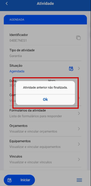 Se na tentativa de iniciar a atividade aparecer a mensagem "atividade anterior não finalizada", a permissão para iniciar atividades fora de ordem está desativada. Nesse caso, é necessário seguir a ordem que o gestor colocou as atividades.