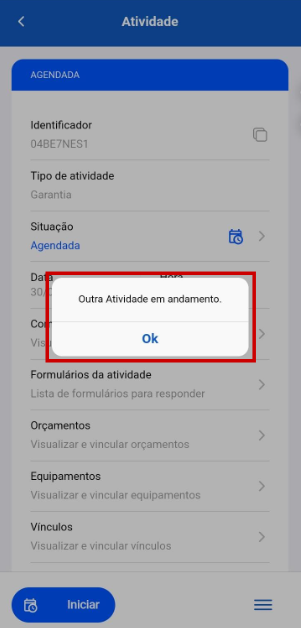 Caso apareça a mensagem "outra atividade em andamento" ao tentar iniciar uma ordem de serviço, significa que outra atividade já foi iniciada e a permissão de iniciar atividades simultaneamente não está ativa.