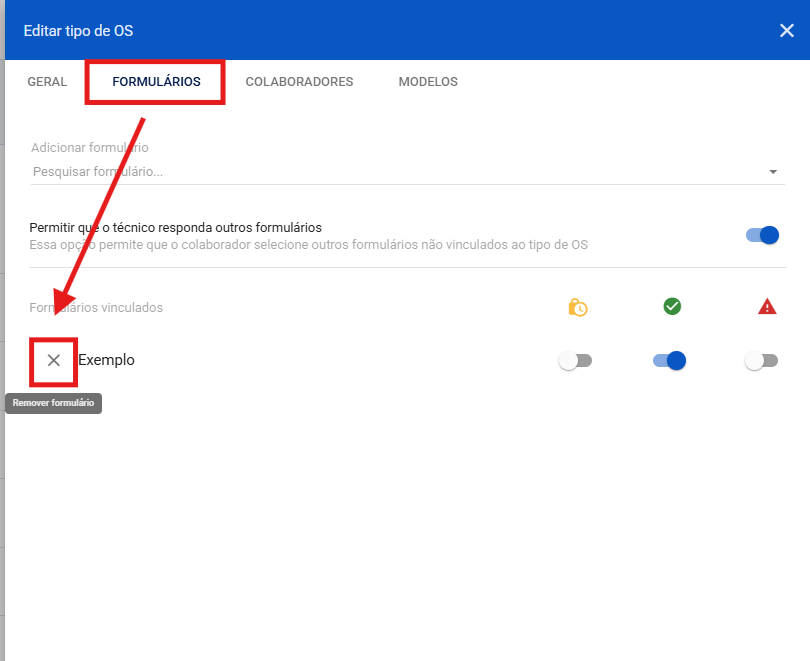 Você também pode estar fazendo esse processo manualmente, basta seguir em Configurações » Cadastros » Tipos de OS, clique em Editar no tipo que deseja e na aba “Formulários” clique em “Remover formulário“