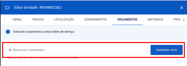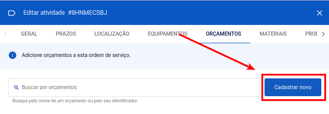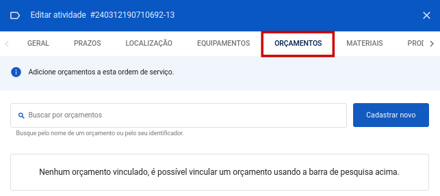 Também é possível criar um orçamento dentro da atividade. Para criá-lo basta clicar em "Cadastrar novo".