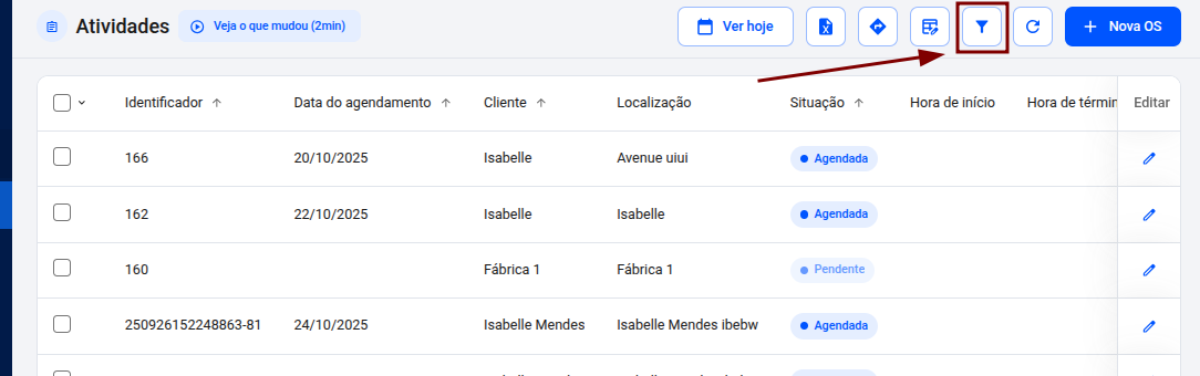 Passo 2: Com os filtros é possível segmentar o resultado das atividades, você pode filtrar as atividades por diversas opções. Para visualizar as opções de filtros, basta clicar no ícone de filtro no canto superior