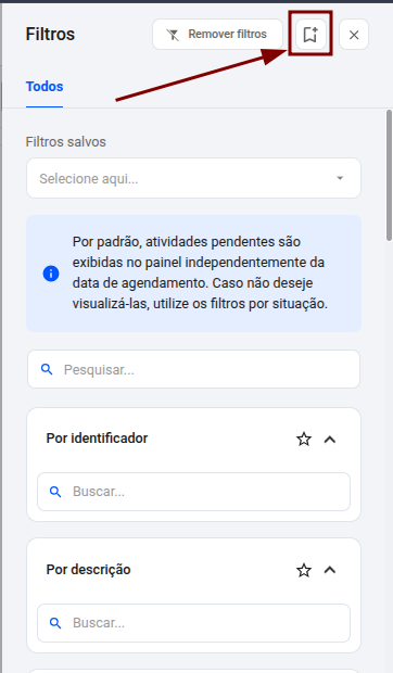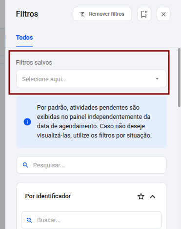 Para selecionar um filtro padrão ou um filtro customizado salvo, basta preencher o campo “Filtros salvos”