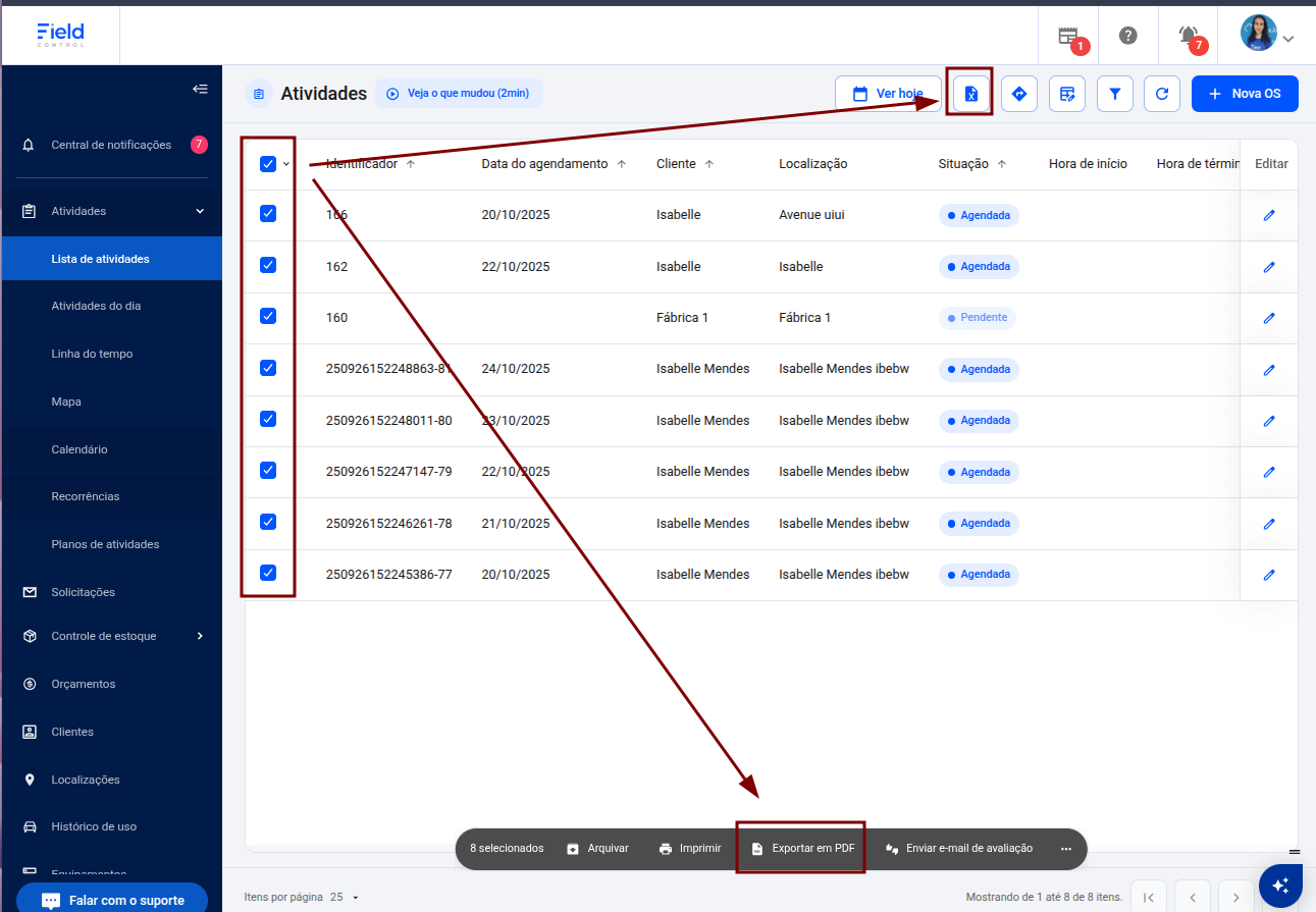A listagem de atividades é ideal para obter relatórios avançados e detalhados sobre os serviços prestados em campo.