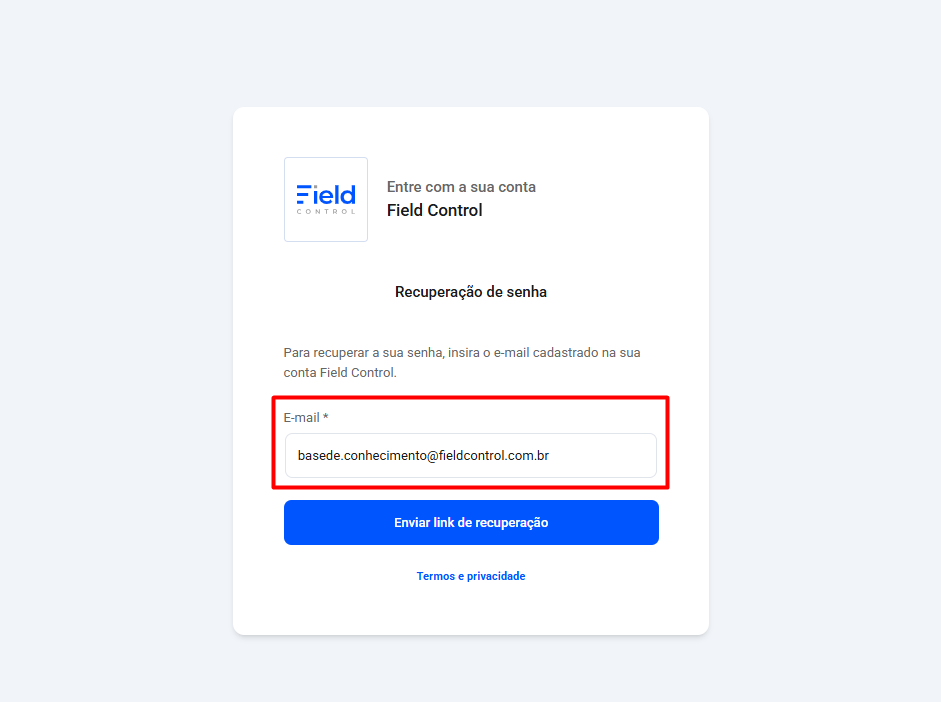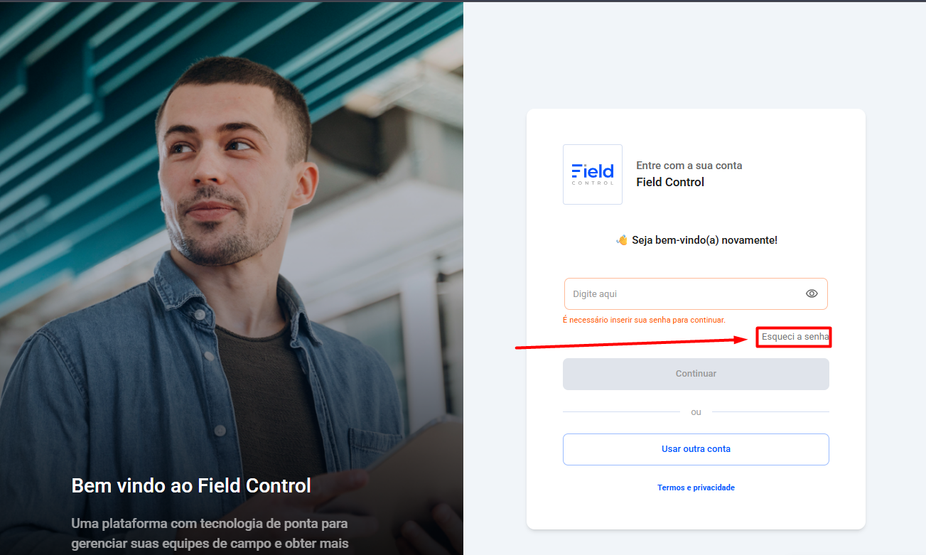 Passo 1: Acesse a página de login do painel de gestão Field Control, e clique em "Esqueceu a senha?"