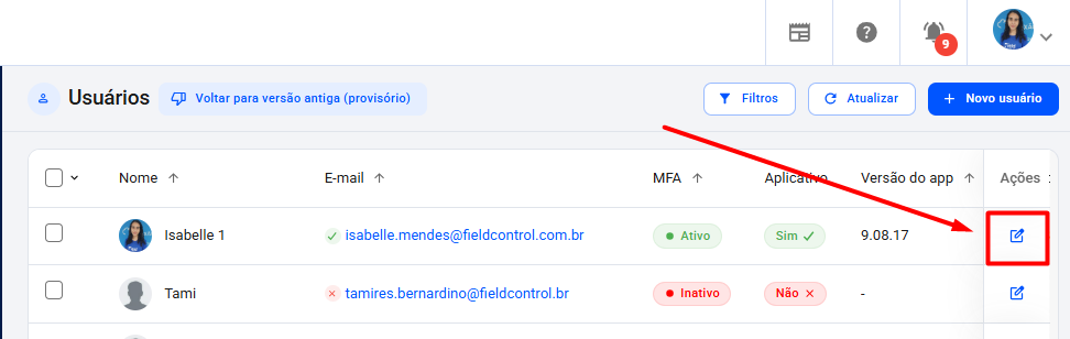 Passo 1: Na tela de Usuários clique em "Editar" no usuário que deseja