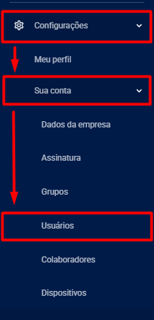 Passo 1: Para adicionar um novo usuário, basta no menu a esquerda ir em Configurações » Sua conta » Usuário